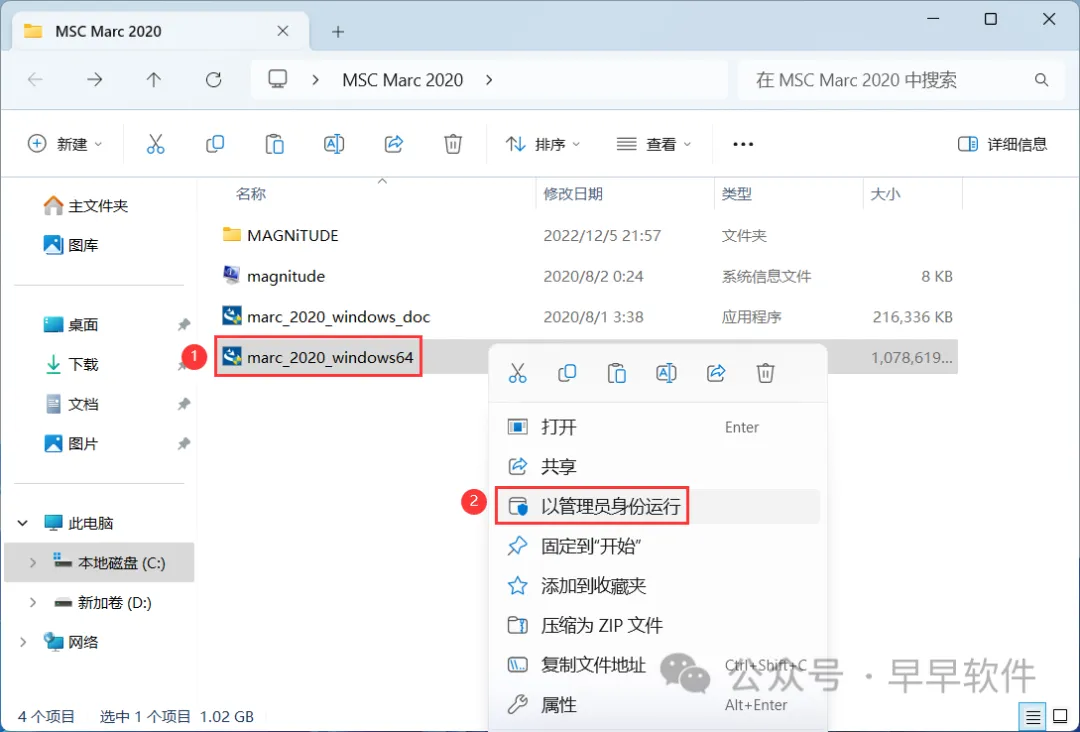 22、回到MSC Marc 2020文件夹,找到【marc_2020…】应用程序,右键选择【以管理员身份运行】它