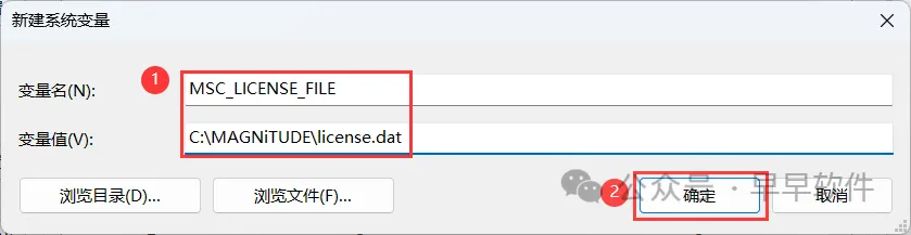 38、变量名输入:MSC_LICENSE_FILE;变量值输入:C:\MAGNiTUDE\license.dat,再点击【确定】