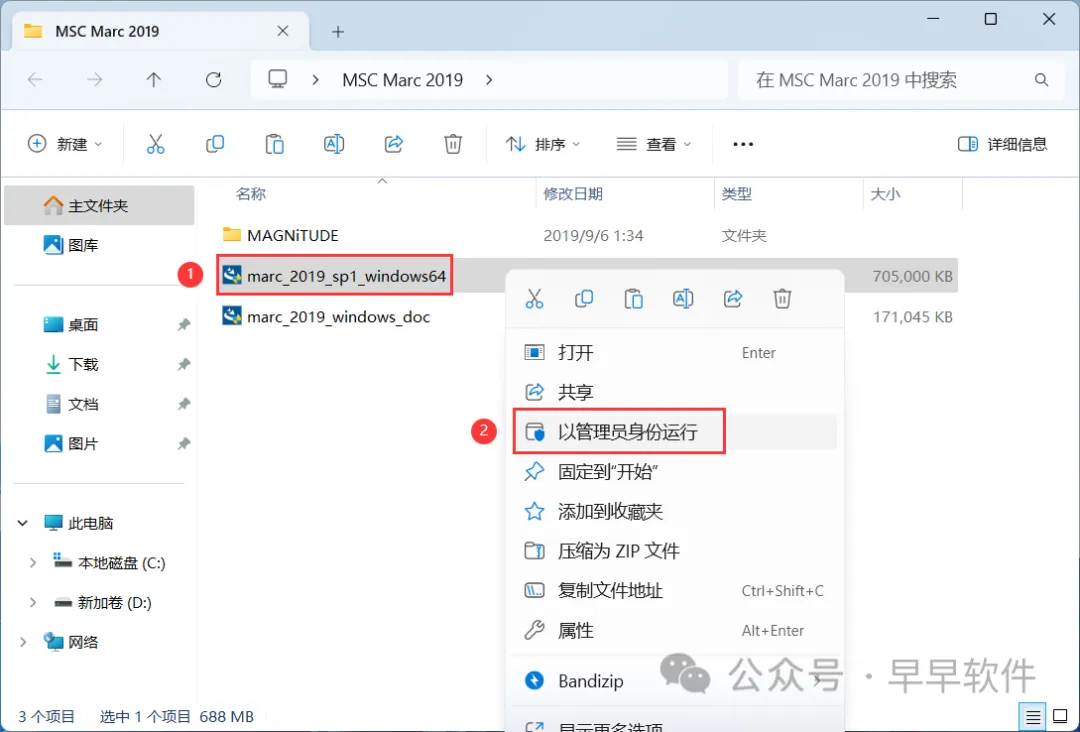 20、回到MSC Marc 2019文件夹,找到【marc_2019…】应用程序,右键选择【以管理员身份运行】它