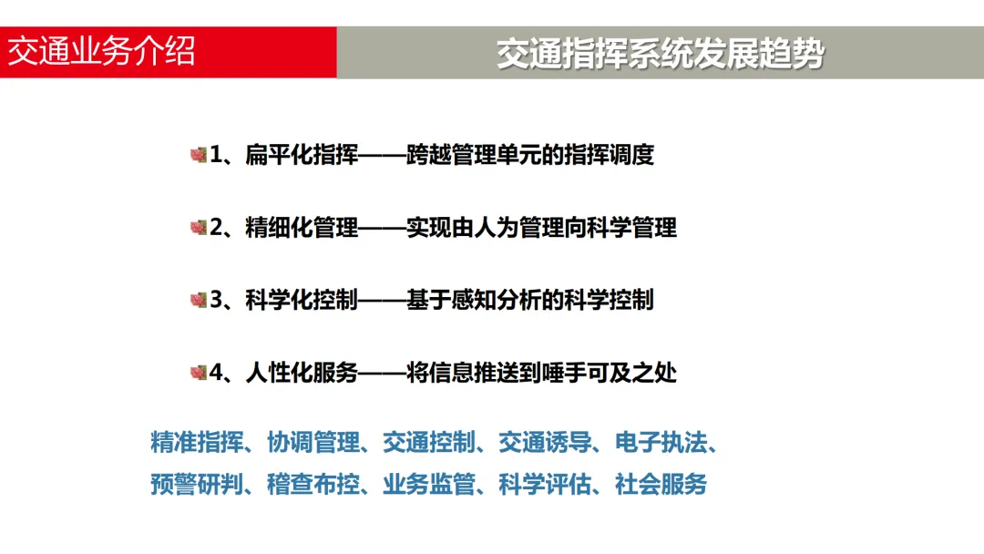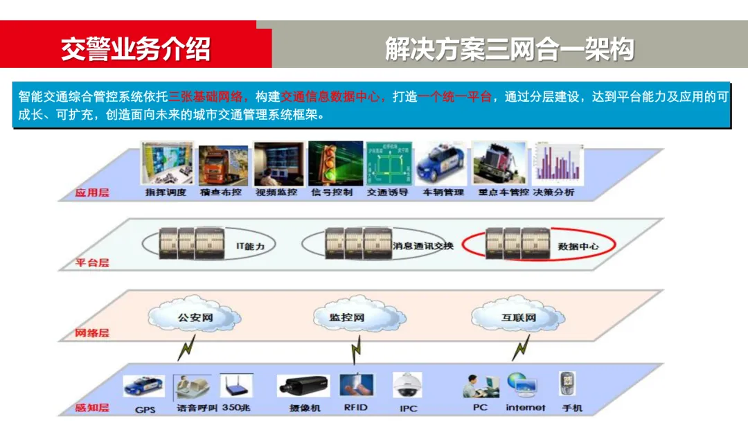 现代智慧交通系统依托视频监控网、公安信息网和互联网,构建统一的数据中心与综合管控平台。通过“感知层、网络层、平台层、应用层”的分层建设,实现了平台能力的可成长、可扩展。这一架构将各类交通信息数据(如RFID、GPS、视频流等)汇聚融合,为上层丰富的业务应用提供坚实支撑,旨在实现“精准指挥、协调管理、科学控制、人性服务”的目标。
