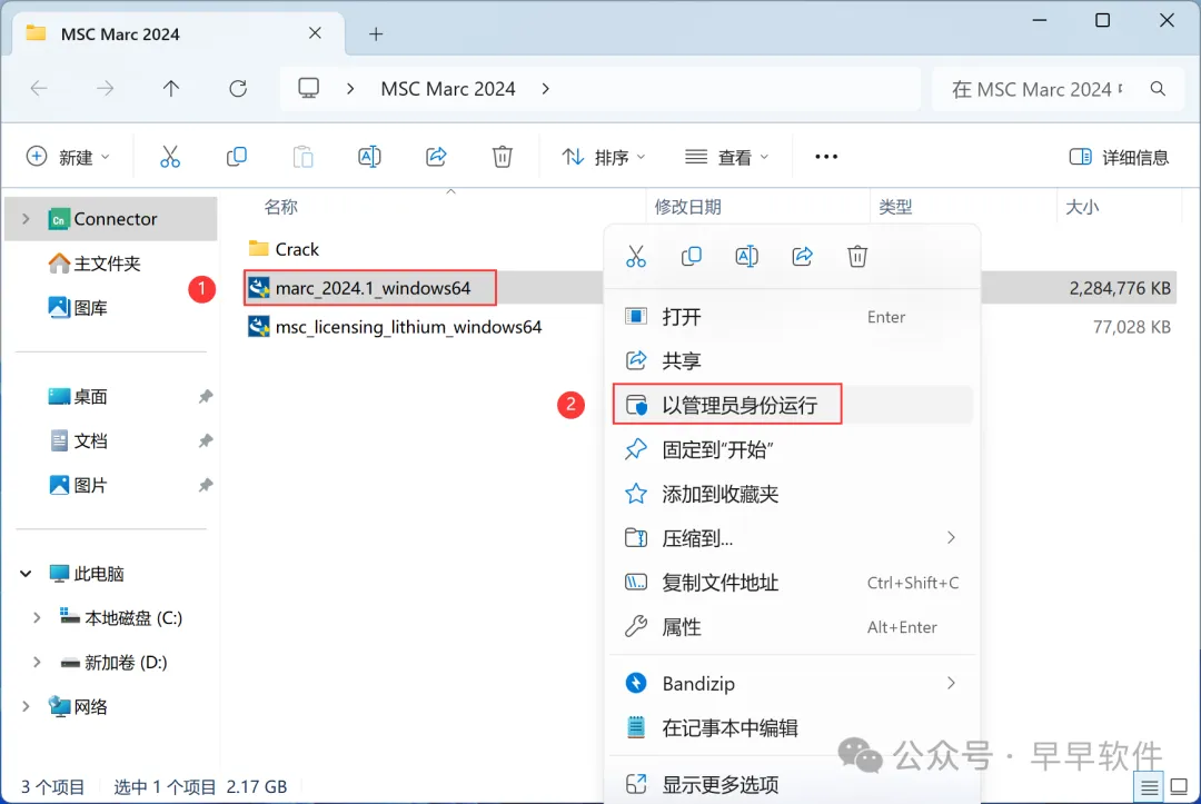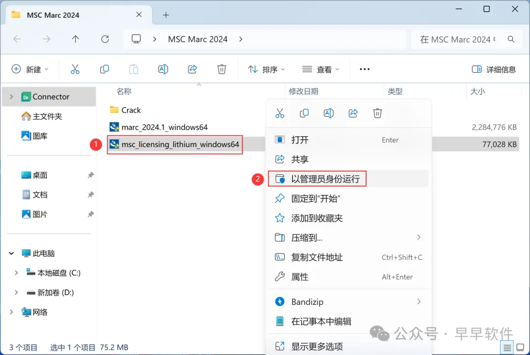16、回到MSC Marc 2024文件夹,找到【marc_2024…】应用程序,右键选择【以管理员身份运行】它