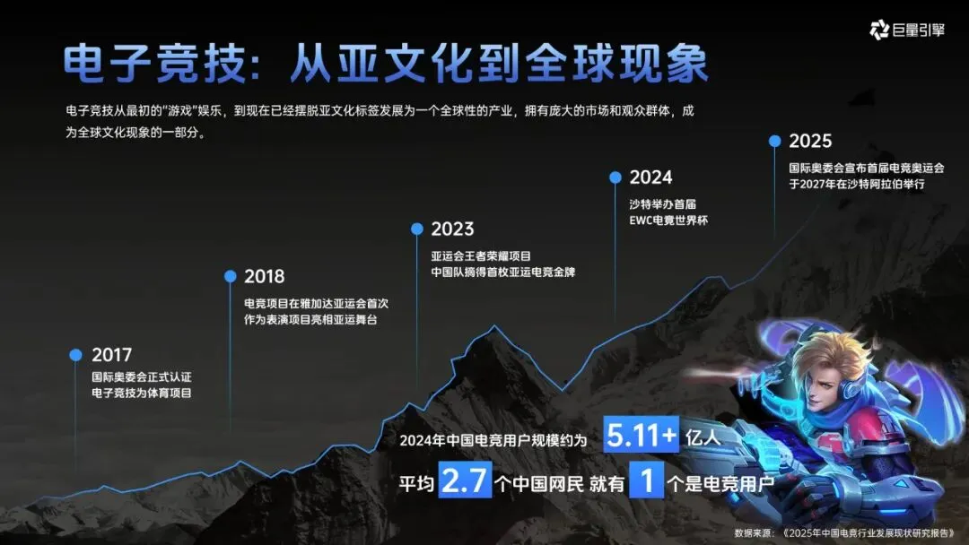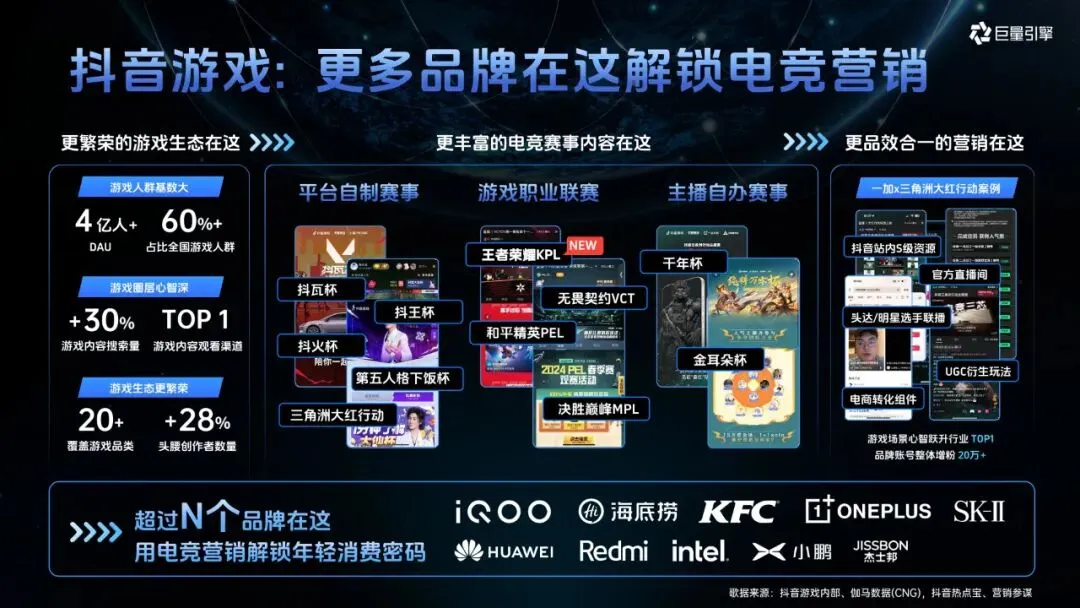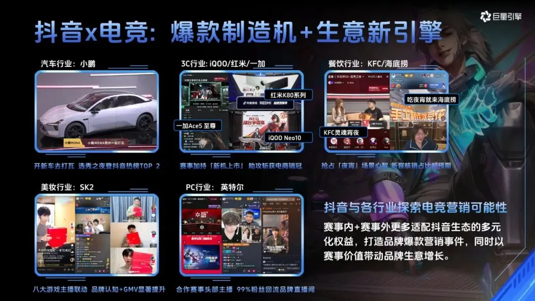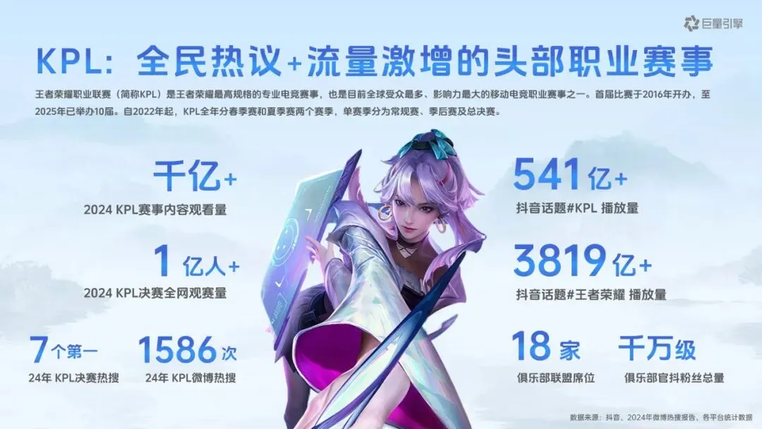 电子竞技已从亚文化成长为全球现象,国际奥委会不仅认证其为体育项目,还将举办首届电竞奥运会,王者荣耀作为国民级 IP,积累了庞大的年轻用户群体,18-35 岁用户占比达 75%。而 KPL 作为王者荣耀最高规格职业赛事,影响力持续攀升,2024 年赛事内容观看量超千亿,决赛全网观赛量破亿,抖音平台相关话题播放量更是居高不下,#KPL 播放量达 541 亿 +,# 王者荣耀 超 3819 亿 +,其受众年轻化、分布均衡且消费力强劲,单次决赛就能为当地带来超 7000 万元直接经济效益。抖音凭借庞大的游戏用户基数、丰富的赛事生态和品效合一的营销能力,已成为品牌解锁电竞营销的重要平台,此前与小鹏、iQOO、KFC 等多个行业品牌的合作均取得亮眼成果。
