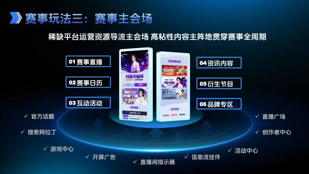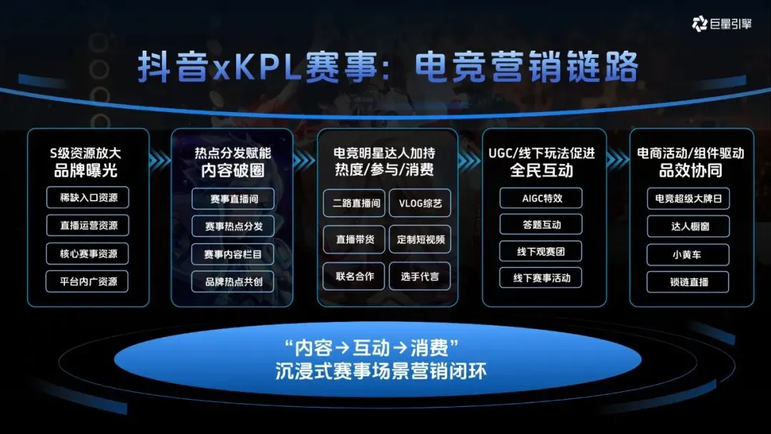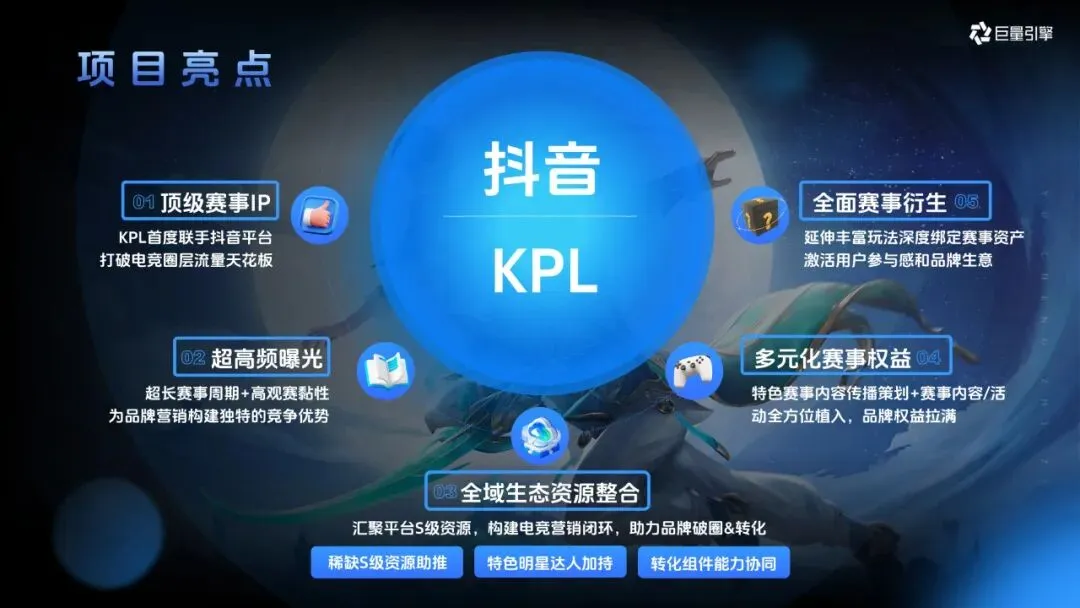 2026 年 KPL 与抖音的首度联手,成为项目核心亮点。此次合作打破了电竞圈层的流量天花板,依托 KPL 顶级赛事 IP,打造了全面的赛事衍生体系和超高频曝光场景。超长赛事周期搭配高观赛黏性,为品牌构建了独特竞争优势,同时整合了抖音全域 S 级资源,包括稀缺入口、直播运营、核心赛事及平台广告资源,再加上明星达人加持与转化组件协同,形成了 “内容→互动→消费” 的沉浸式赛事场景营销闭环,既提升品牌曝光度,又能有效带动转化。