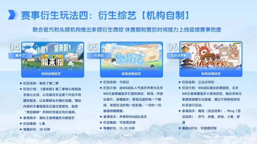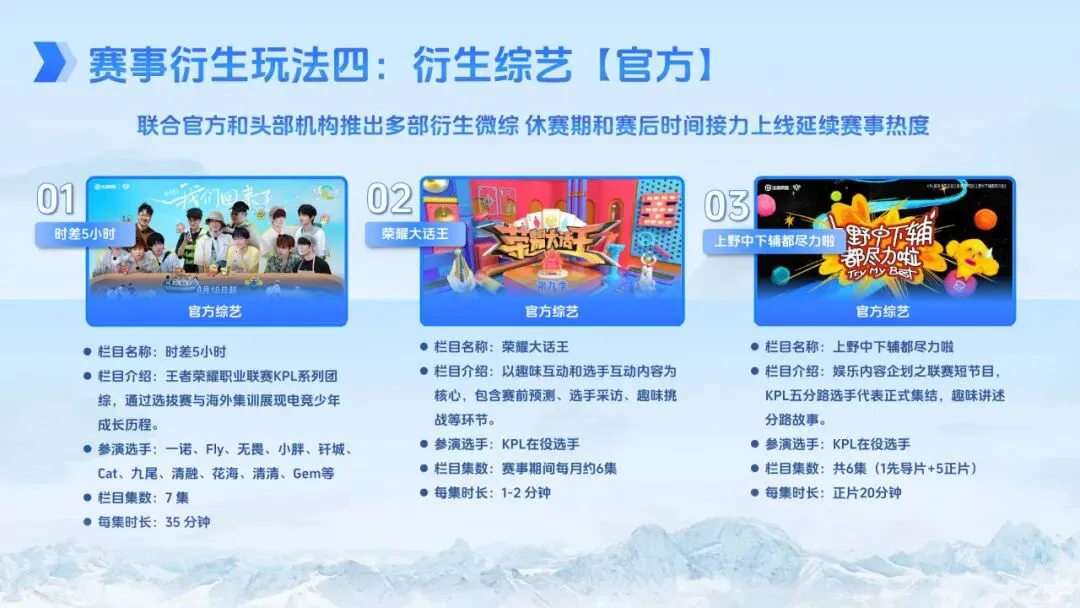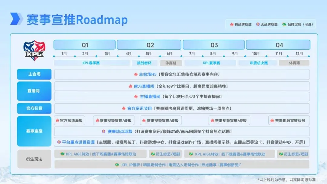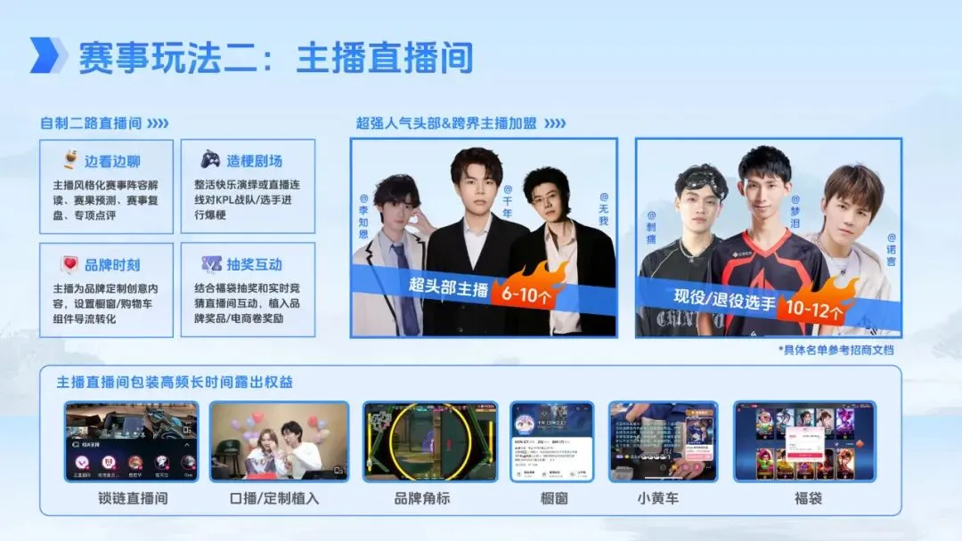 项目规划覆盖全年,赛事安排紧凑且跨度广泛。2026 年 KPL 春季赛、夏季赛、挑战者杯及年度总决赛相继开展,单赛季比赛日约 60 个,全年赛事周期长、触达频次高。宣推方面,主会场 H5 贯穿全年,主播直播间每日至少 3 个同步运营,官方资讯节目高频更新,同时整合平台主话题、搜索阿拉丁、开屏广告等重点运营资源,结合 AIGC 特效、线下联动、衍生内容创作等形式,持续放大赛事热度。品牌可根据需求选择不同阶段的合作权益,通过 IP 授权、明星合作、热点随享等多种形式,实现全年持续曝光与生意增长。
