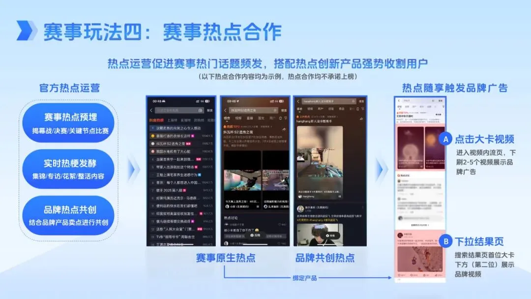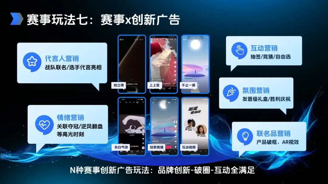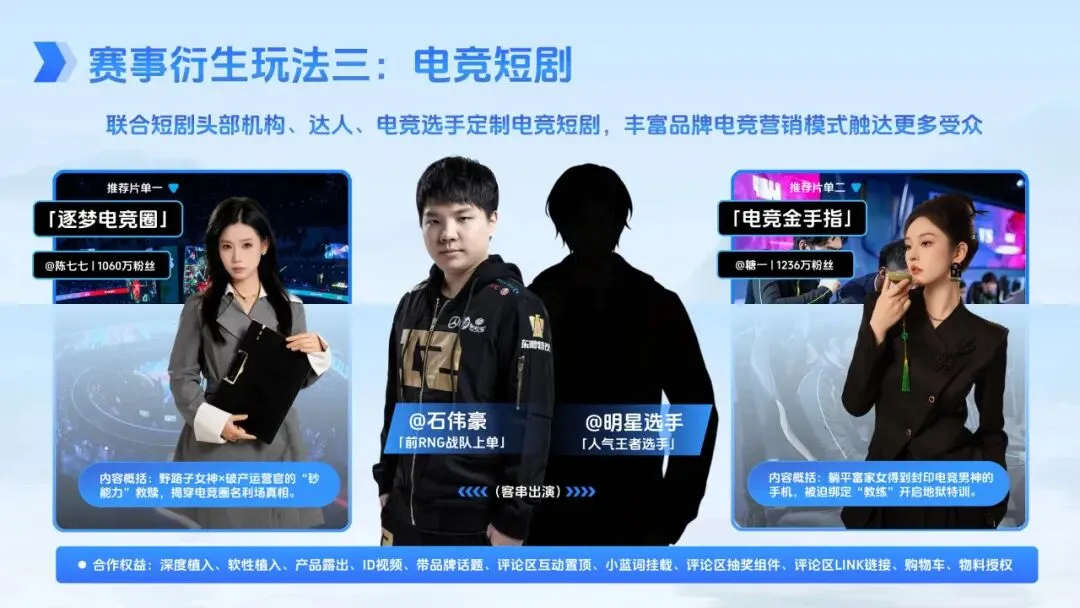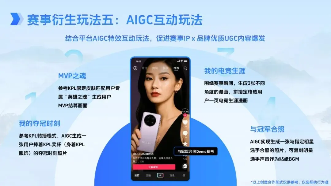 赛事衍生玩法进一步拓展了营销边界。IP 授权方面,品牌可借助 KPL 英雄皮肤、战队及选手资源,开发联名周边、绑定产品附赠礼品,或举办线下授权活动与战队 / 选手共创内容;明星合作邀请具备 “电竞基因” 的艺人担任观赛嘉宾、参与短视频共创、水友赛等,放大品牌破圈势能;同时还推出电竞短剧与多部衍生微综,在休赛期延续赛事热度,AIGC 互动玩法则能生成专属英雄形象、夺冠照片等优质 UGC 内容,激发用户参与热情。此外,抖音丰富的达人生态,涵盖二次元 COS、技术流主播、赛事解说等多个细分赛道,可满足品牌差异性合作需求,从品牌代言到直播带货多维度赋能。