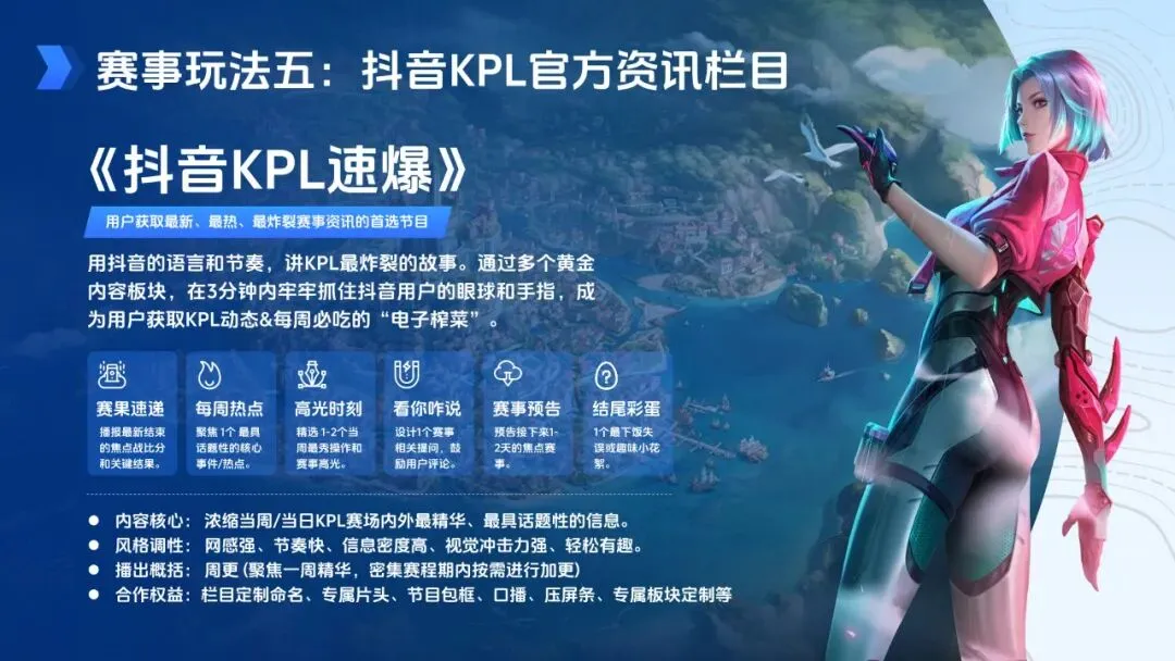 合作玩法丰富多元,覆盖线上线下多个场景。线上方面,官方直播间推出定制礼物、答题互动等创新产品,搭配压屏条、关注组件等导流工具助力品牌转化;主播直播间打造风格化二路解说、造梗剧场,融入品牌定制内容与抽奖互动,超头部主播及现役、退役选手的加盟进一步放大影响力。此外,赛事主会场整合平台运营资源,贯穿赛事全周期,热点合作借助赛事关键节点与热梗发酵提升品牌曝光,官方资讯栏目《抖音 KPL 速爆》以网感强、节奏快的风格成为用户获取赛事信息的首选,为品牌提供定制命名、口播等多元权益。线下则通过多城市观赛团、品牌定制展区、颁奖环节植入等形式,打造沉浸式粉丝互动氛围。