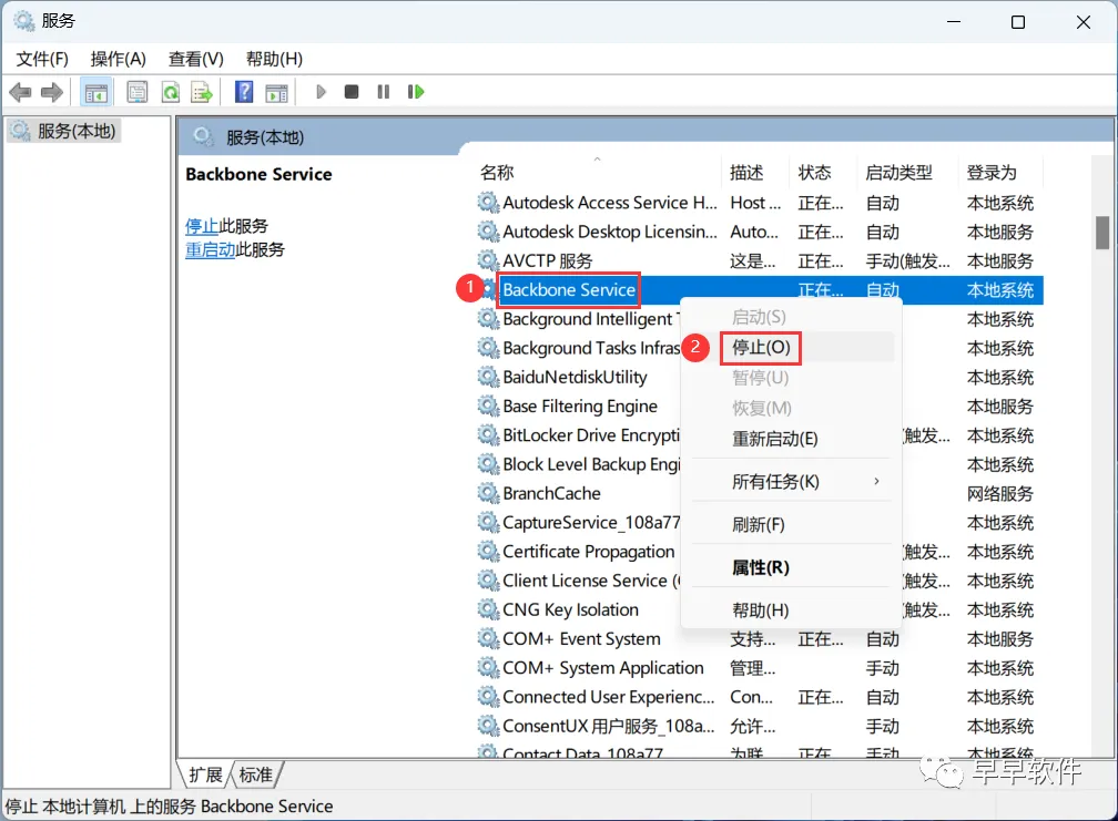 21、找到【Backibone Services】,右键它点击【停止】