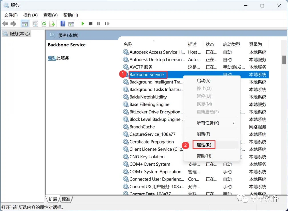 22、右键【Backibone Services】点击【属性】