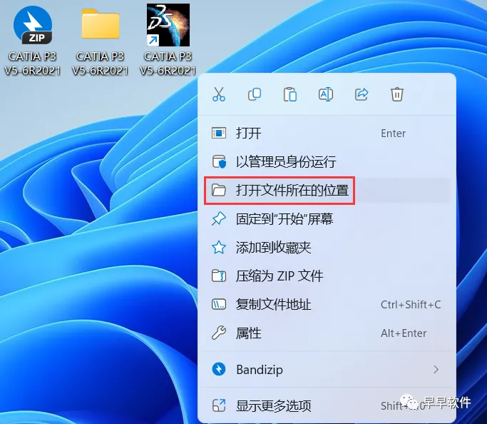26、回到桌面,右键桌面上的【CATIA P3 V5-6R2021软件图标】,点击【打开文件所在的位置】
