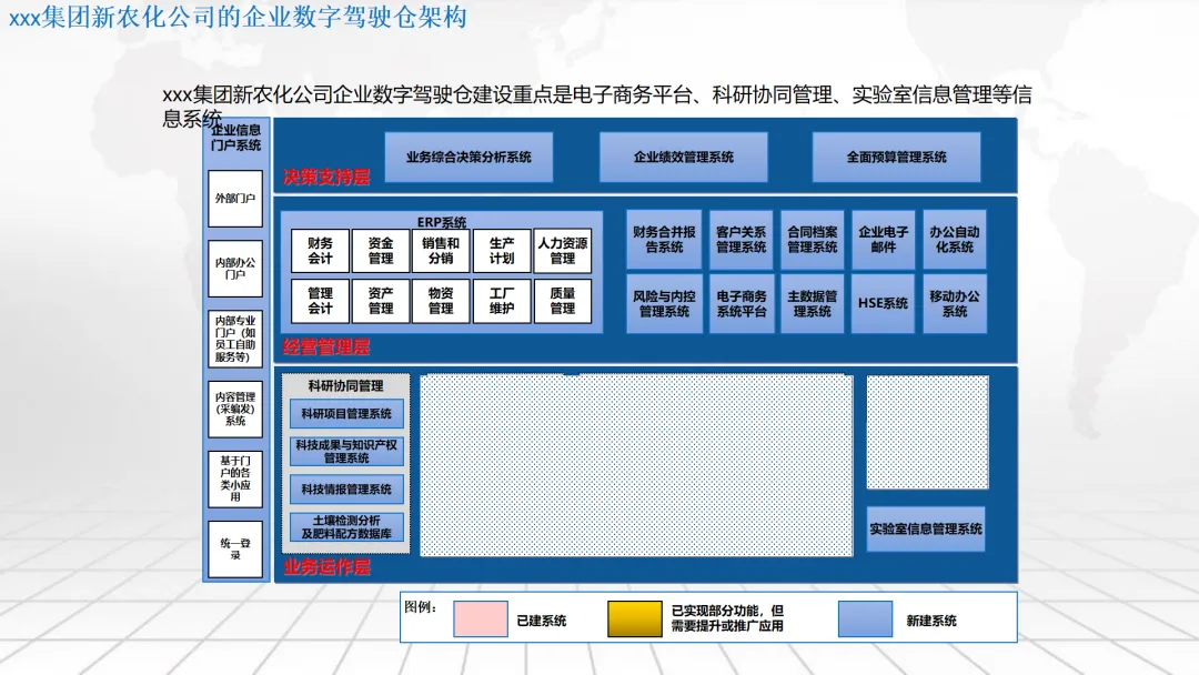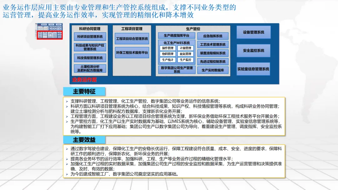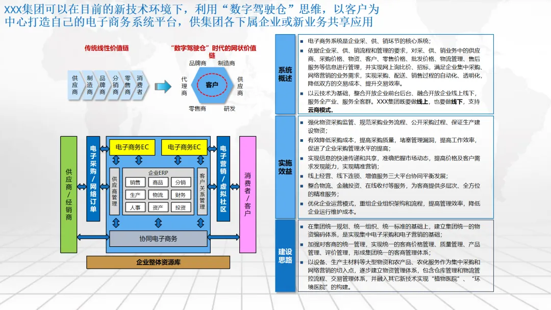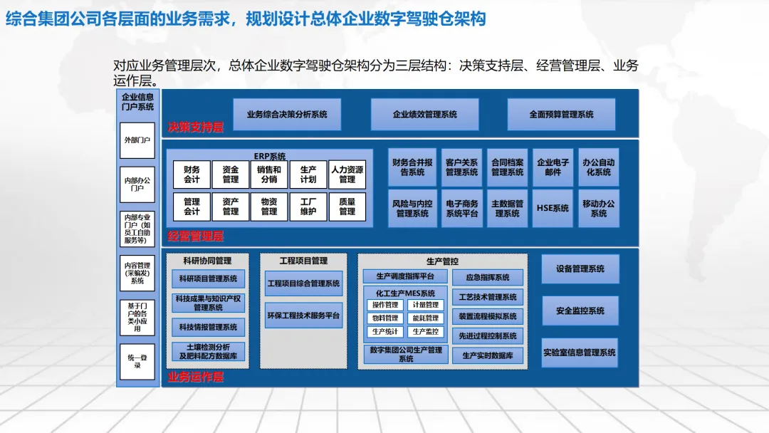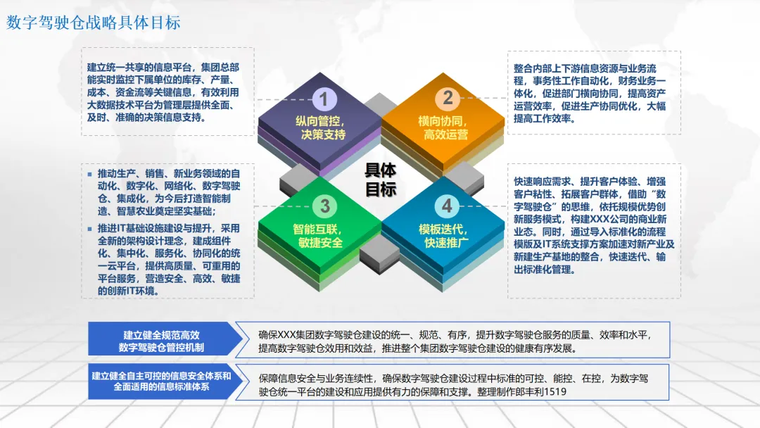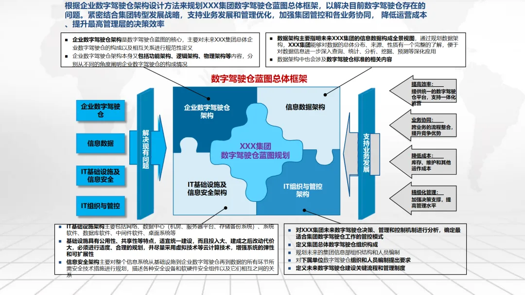 本方案围绕企业数字化转型中的“数字驾驶舱”建设展开,系统阐述了涵盖数据架构、IT基础设施、组织管控、绩效评价及典型应用场景的整体解决方案。内容不仅包括合同档案管理、工程项目管理、测土配肥、环保技术服务和化工生产调度等业务模块的数字化设计,还强调通过集成ERP、CRM、供应链等系统,构建统一的数据底座与决策支持平台。同时,提出以平衡计分卡为框架的IT绩效评价体系,并规划了从集中管理到分级运维、再到持续优化的三阶段实施路径,旨在助力企业实现精细化运营、科学决策与战略落地。