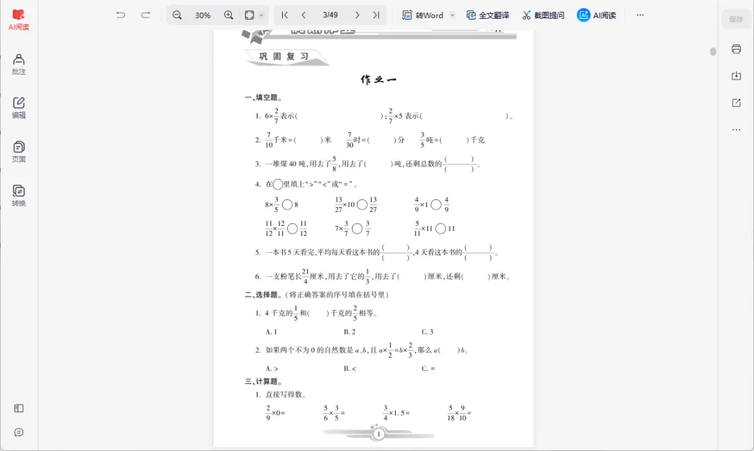 >「《寒假作业》数学1-6年级上册」,免费下载