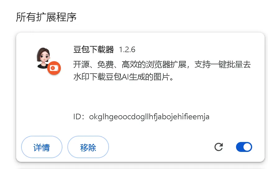 豆包生图是我用的比较频繁的工具,出图快,生图效果不错,但是正常保存的图片右下角会有豆包AI生成的水印标识。像上图这样的纯色单一背景,通过PS之类的图片编辑工具,使用填充或者仿制图章等方法简单处理就行,但如果是复杂的色彩,处理后多少会有一些痕迹。并且下载图片之后,还要使用其他工具进行处理,虽然简单,但也浪费时间。今天推荐一个浏览器插件,可以自动获取豆包生成的图片,自动去除AI水印标识,下载即为无水印原图。并支持多张打包下载。非常方便。可以多次生成图片,然后一次性勾选满意的图片下载就行。导入方法:下载zip压缩包,解压,打开浏览器,选择“管理扩展程序”选中刚刚解压后的文件夹即可。然后就能在浏览器里使用该插件了。插件下载地址: