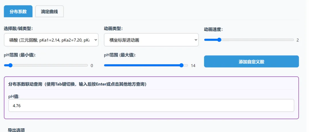 这个HTML文件实现了一个“酸碱分布系数与滴定曲线图可视化工具”,主要功能包括: