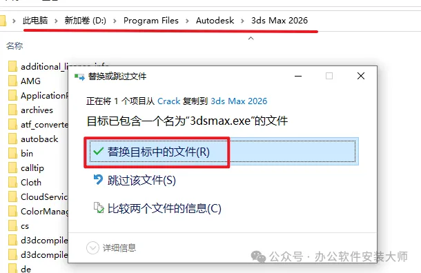 2.打开解压好的3Dds Max 2026文件夹,鼠标选中【Setup】右键点击【以管理员身份运行】4.点击【…】选择安装位置,注意安装位置不能出现中文,可以在D盘新建一个命名为【3ds2026】的文件夹,选择好点击【下一步】5.根据自己需要选择安装的组件(默认全选就行),然后点击【安装】7.程序安装完成,先不要启动点击右上方X号关闭窗口1.返回刚才解压好的文件夹,找到【Crack】文件夹并双击打开,选中【3dsmax】文件复制2.返回电脑桌面找到【3ds Max2026】图标,选中鼠标右键点击【打开文件所在位置】3.在空白处把刚才复制文件粘贴到这里,点击【替换目标中的文件】4.返回电脑桌面把【图标删除】(此图标点击打开是英文版)5.点击电脑开始菜单,把3ds Max 2026 Simplified Chinese拖动到电脑桌面(这个才是中文版),返回桌面双击图标就可以开始使用6.双击图标打开,点击【继续】,打勾【不再显示】,就可进入使用1.有关资源均收集来自网络与网友提供,任何涉及商业盈利目的的均不能使用,否则后果将由您自己承担。
