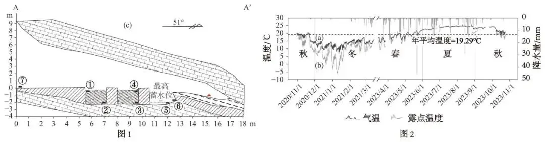 广西桂林甑皮岩已知遗址是我国华南地区重要的新石器时代洞穴遗址。在考古发掘后,当地保留考古坑不回填。近年来,甑皮岩遗址文化层上溶蚀坑洞受到文物保护学家的关注。露点温度是水汽达到饱和时的气温。图1示意甑皮岩遗址剖面,图2示意甑皮岩遗址不同季节平均气温和露点温度变化。