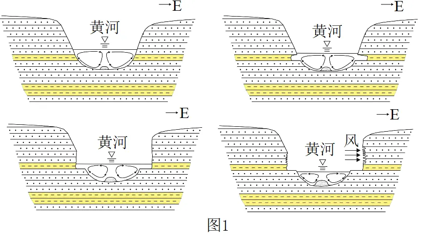 晋陕峡谷山西临县黄河东岸崖壁上发育的微地貌,因似人工雕刻栩栩如生,而被形象地称为“黄河浮雕”。专家根据沉积环境和最底层沉积物认为浮雕形成于不会早于6万年前。图1示意“黄河浮雕”的形成过程,图2示意“黄河浮雕”沉积剖面。