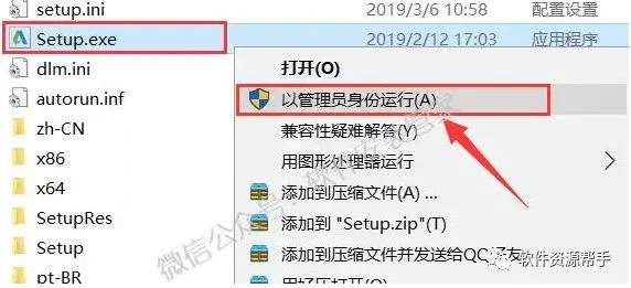 3,双击打开【安装包】文件夹。选中【Setup】可执行文件,鼠标右击选择【以管理员身份运行】。