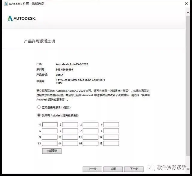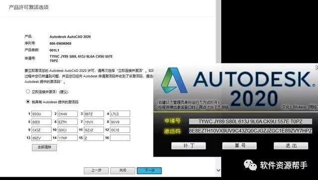 16,复制申请码,粘贴进注册机第一栏,点击补丁,再点击注册机中间的按钮,然后在注册机第二栏就会生成激活码,复制激活码,粘贴进CAD里面,点击下一步。