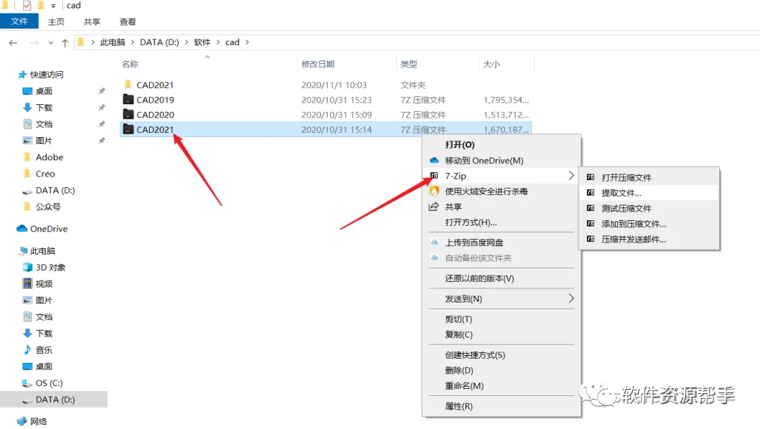 1.鼠标右击【CAD2021压缩包选择解压