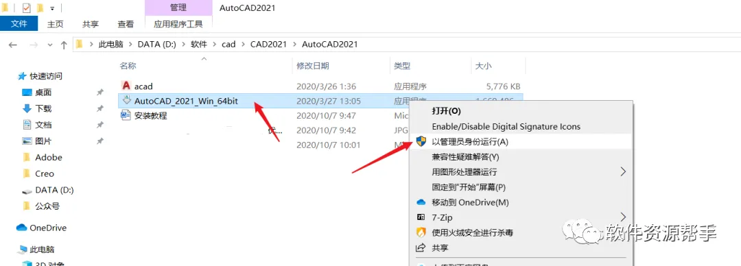 2.打开解压后的文件夹,鼠标右击【AutoCAD_2021_Simplified_Chinese_Win_64bit_dlm.sfx】选择【以管理员身份运行】。