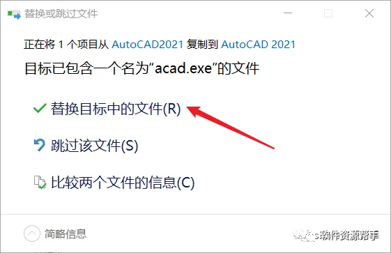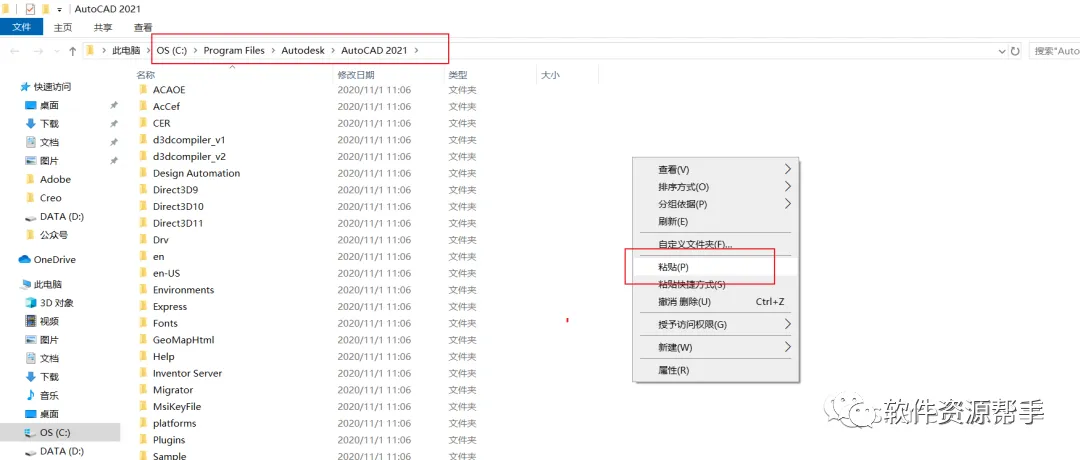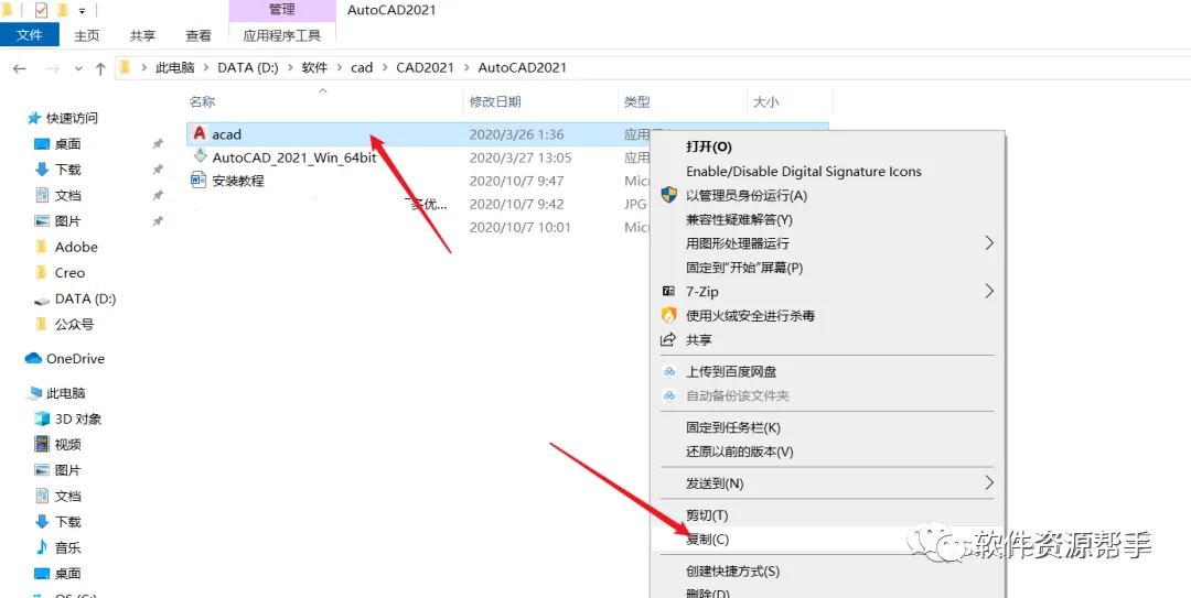 9.打开安装包解压后的CAD 2021】文件夹,鼠标右击【acad】选择【复制】