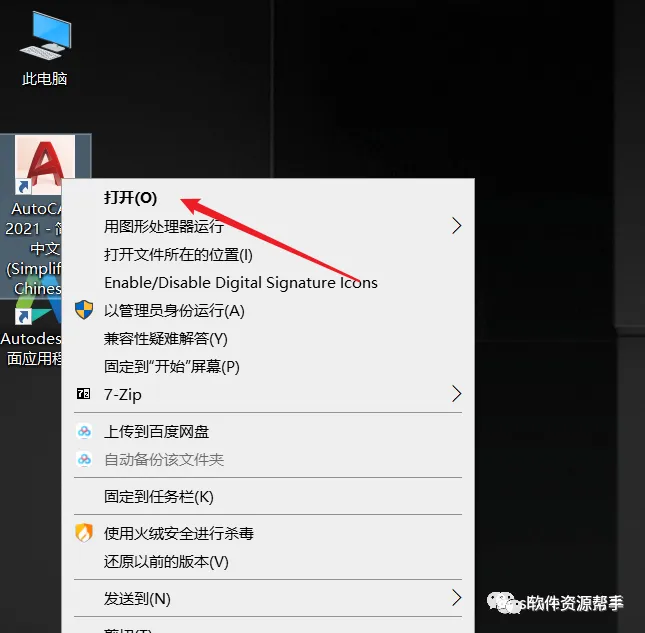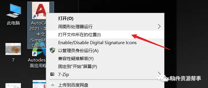 10.标右击桌面【AutoCAD 2021 - 简体中文 (Simplified Chinese)】图标选择【打开文件所在的位置】。