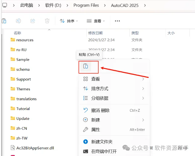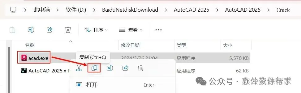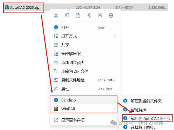 1.选中下载的安装包,右键选择解压到"AutoCAD 2025"文件夹