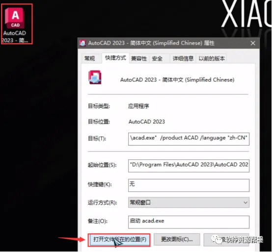 10、找到桌面的CAD2023快捷方式,右键,属性,点击【打开文件所在的位置】。