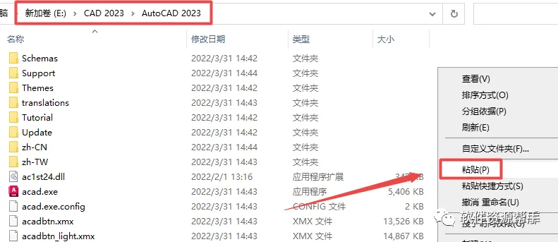 11、在打开的文件夹空白处,鼠标右键“粘贴”刚才复制的“AutoCAD2023-2022-2021Patch.exe”文件