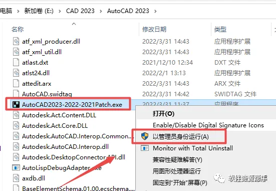 12、找到并选中复制过来的“AutoCAD2023-2022-2021Patch.exe”文件,鼠标右键选择“以管理员身份运行