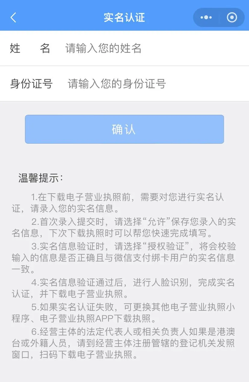 1、实名认证:填写法定代表人、投资人或负责人姓名、身份证号码等信息,点击【确认】。
