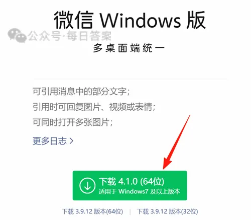 1、使用电脑浏览器访问电脑版微信官网(https://pc.weixin.qq.com/),目前最新版本是4.1.0版本,点击【下载4.1.0(64位)】按钮,并将安装包下载保存到本地电脑。