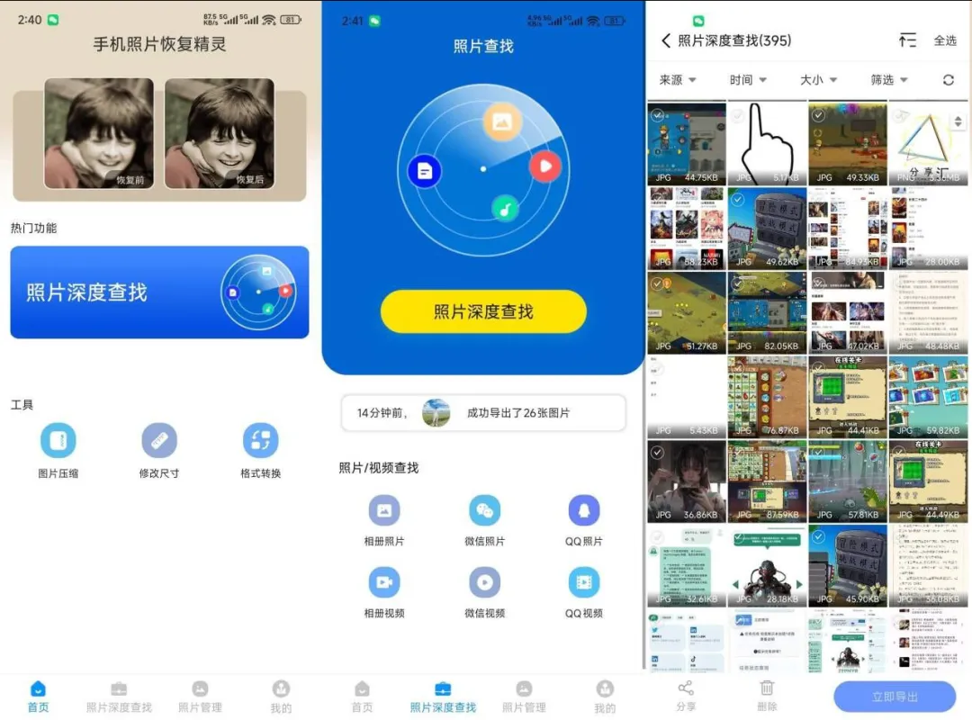 已修复!是手机照片恢复精灵,一款专业又靠谱的照片恢复工具!不管是误删的聊天截图、宝宝成长照,还是手机里的图片、SD卡丢失的照片,它都能通过深度扫描找回,支持JPEG、PNG等主流格式。恢复成功率超90%。