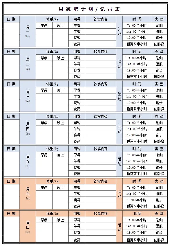 告别无效减肥,我们为你精心设计了一份科学高效的一周减肥计划模板,结合均衡饮食、合理运动与健康生活习惯,助你轻松开启瘦身之旅。该模板包含详细食谱、运动安排、生活建议及可打印追踪表格,让你在一周内看到积极变化,并培养可持续的健康习惯。现在复制上方链接到浏览器,即可免费下载这份专属计划,迈出改变的第一步,开启自信健康新生活!