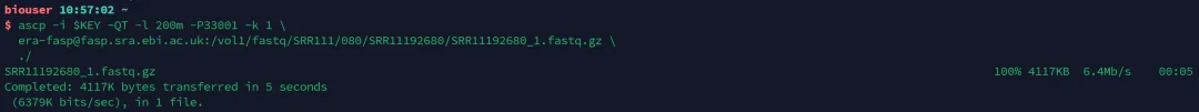 ascp -i $KEY -QT -l 200m -P33001 -k 1 \ era-fasp@fasp.sra.ebi.ac.uk:/vol1/fastq/SRR111/080/SRR11192680/SRR11192680_1.fastq.gz \ ./