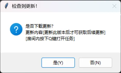 启动时会检查更新,这个群里目前用的游戏版本比较旧(我比较怀疑是不是群共享空间用完了,然后旧文件没清理导致新的压缩包一直无法上传),需要更新。点击是让它进行更新,在我写文章这个时间节点这个更新操作会重复多次