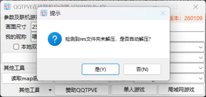 更新完成后会弹出上图这样的界面,我们需要点击是让游戏解压资源(这个仅在首次运行时才需要解压)