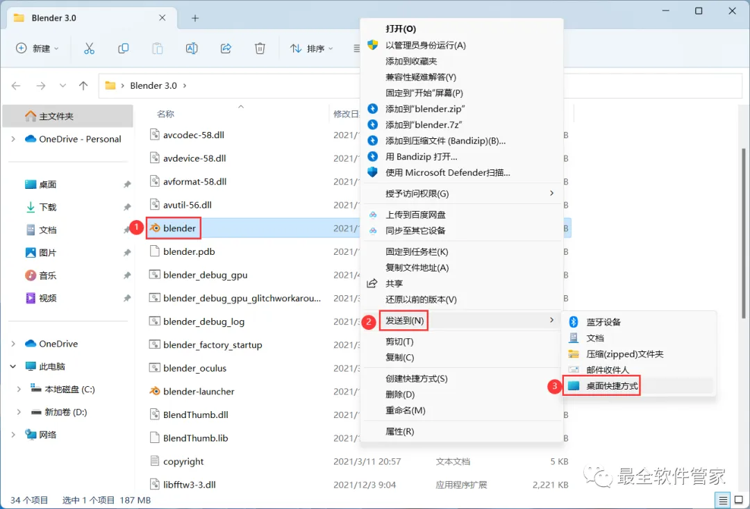 1、下载Blender 3.0软件安装包到电脑上,右键选择【解压到Blender 3.0\】