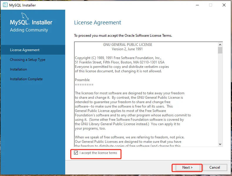 第四步:勾选【I accept the……】,然后点【Next】。