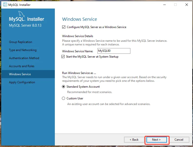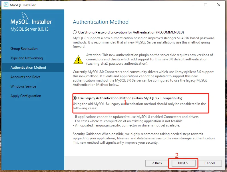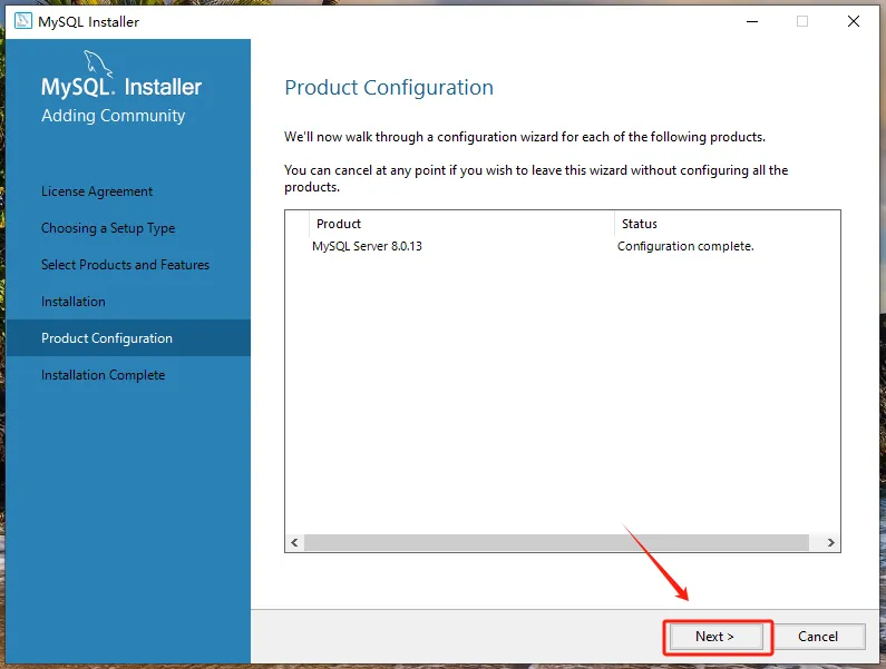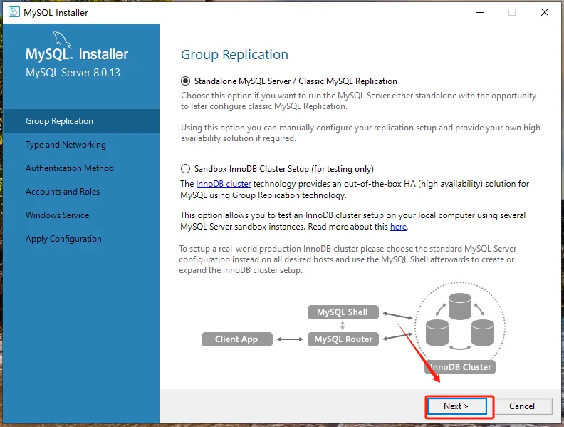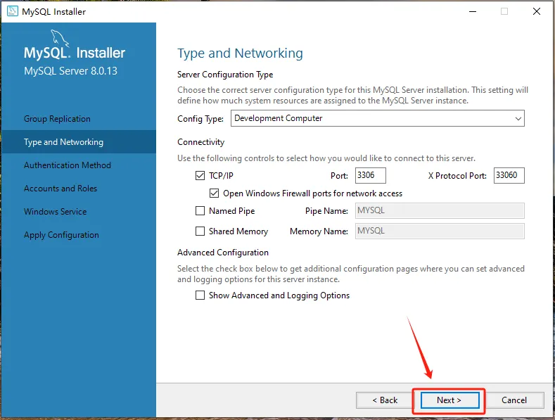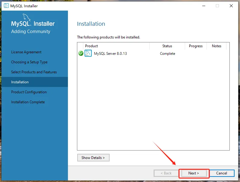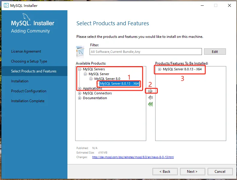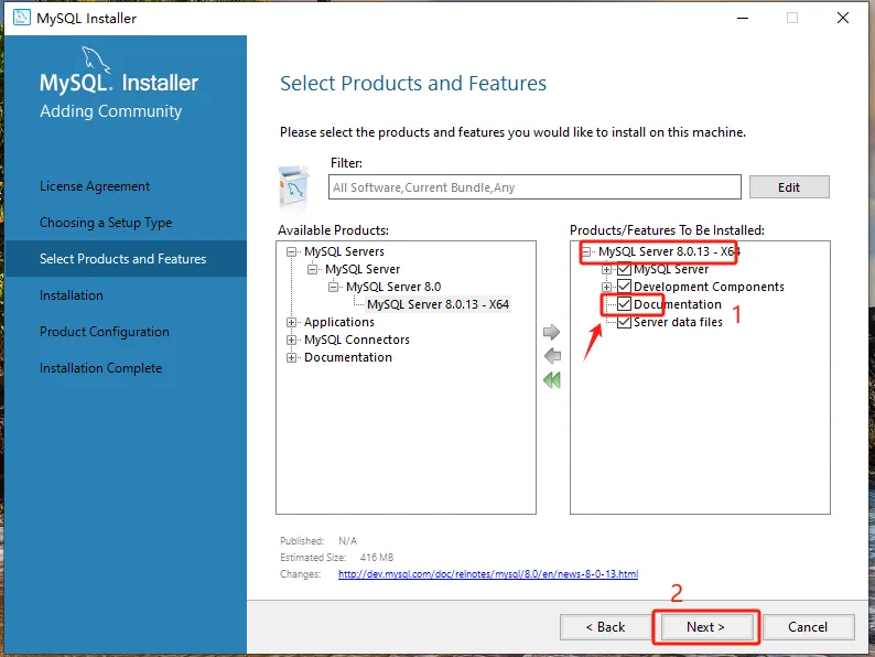 第七步:点击【MySQL Server 8.0.13-X64】前的“+”勾选【Documentation】,点击【Next】。