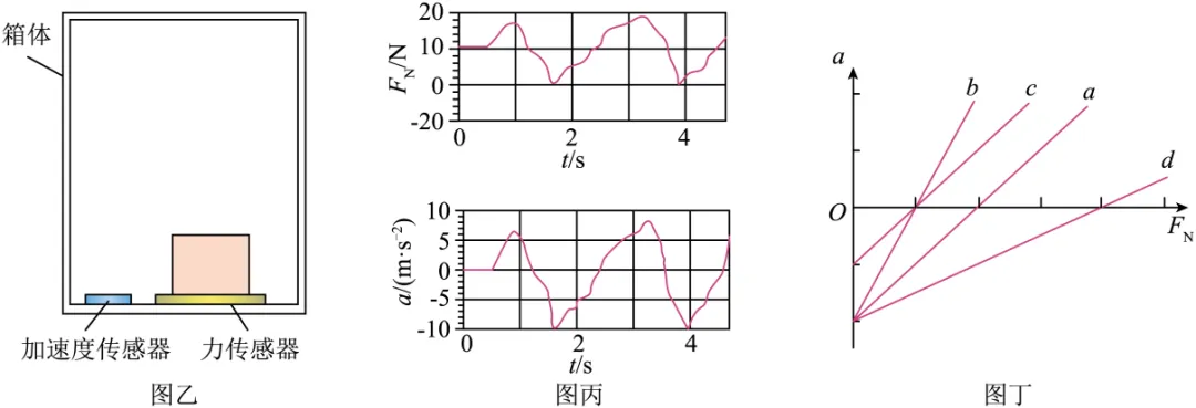 (2)利用图乙装置进行实验,箱体的水平底板上安装有力传感器和加速度传感器,将物体置于力传感器上,箱体沿竖直方向运动。利用传感器测得物体受到的支持力和物体的加速度a,并将数据实时传送到计算机。
