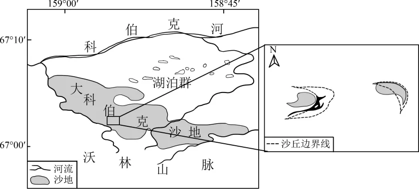 大科伯克沙地是北极圈内典型的风沙活动区。近1万年来,随着气候变暖,该沙地面积由约650km2波动萎缩至62km2。下图示意大科伯克沙地及周边区域。甲地发育有新月形沙丘。据此完成下面小题。