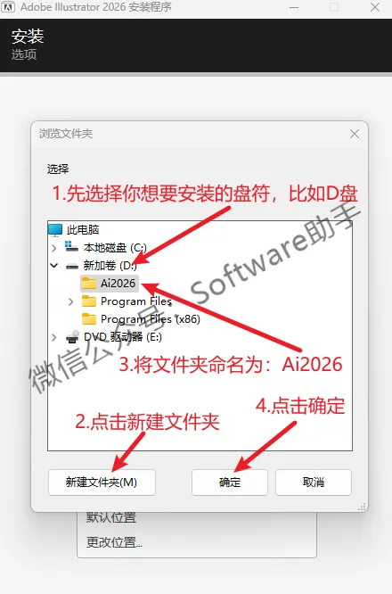 5.先选择你想要将软件安装的盘符(比如D盘),再点击【新建文件夹】,然后将文件夹命名为:Ai2026,最后点击【确定】即可