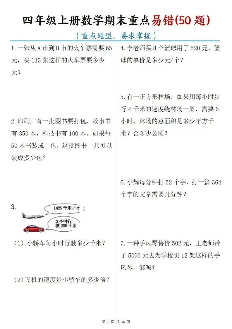 >四年级上册数学期末重点易错(50题),免费下载