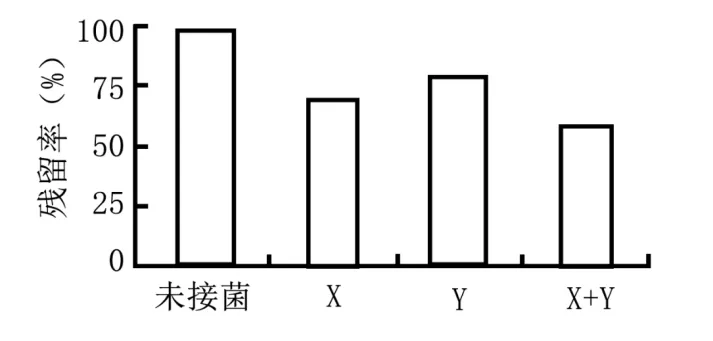 8.微塑料由塑料废弃物风化形成,难以降解,会危害生态环境和人体健康。有人分离到X和Y两种微塑料降解菌,将总菌量相同的X、Y、X+Y(X:Y=1:1)分别接种于含有等量微塑料的蛋白胨液体培养基中,培养一段时间后测定微塑料的残留率(残留率=剩余量/添加量×100%),结果如下图。下列叙述正确的是()