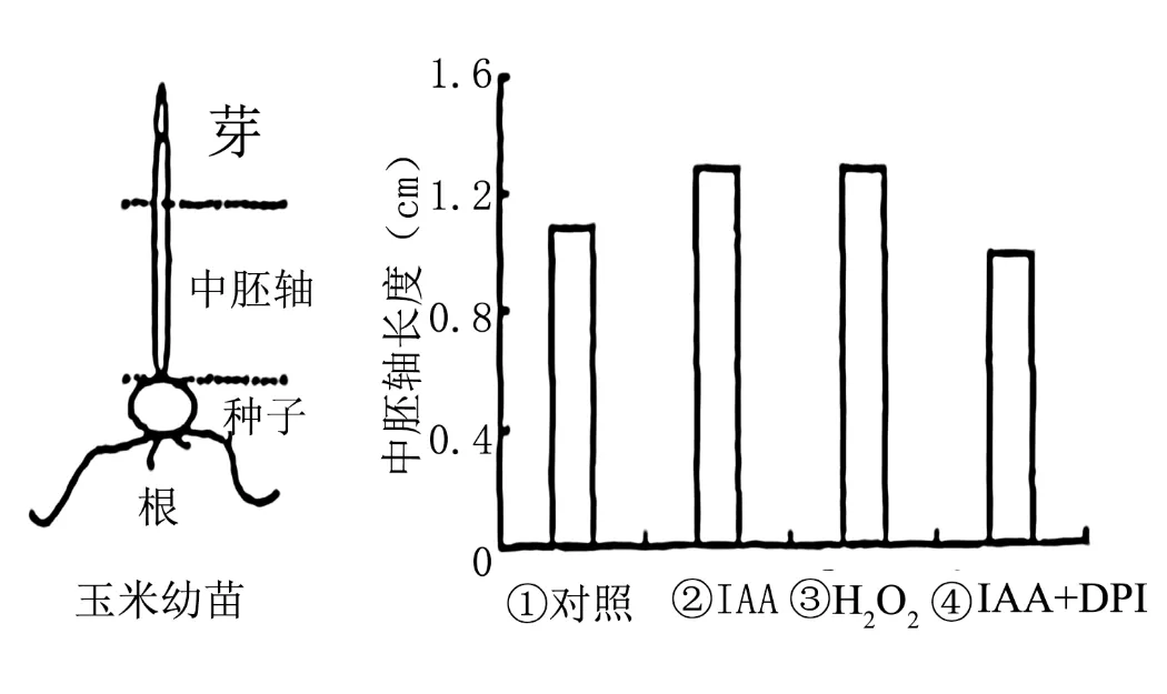 14.生长素(IAA)和H2O2都参与中胚轴生长的调节。有人切取玉米幼苗的中胚轴、将其培养在含有不同外源物质的培养液中,一段时间后测定中胚轴长度,结果如下图(DPI可以抑制植物中H2O2的生成)。下列叙述错误的是()