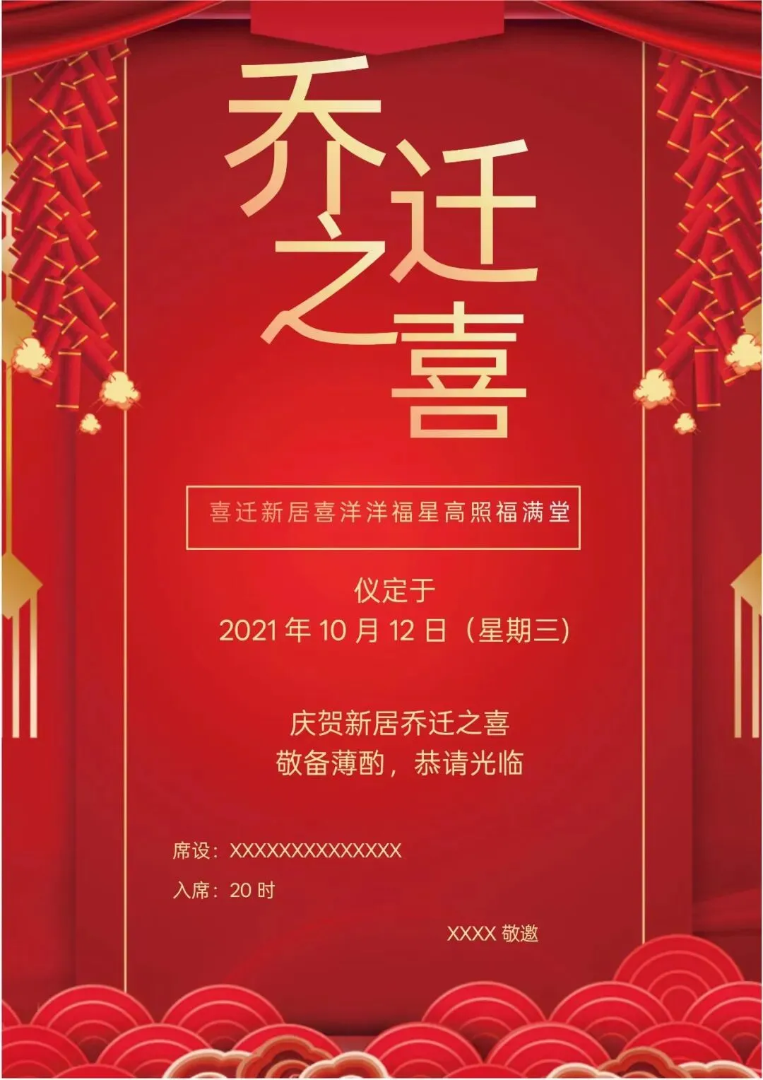 举办乔迁之宴,略备薄酒佳肴,诚邀各位亲朋好友携您家人光临,在此一聚。您的光临使我新居蓬荜生辉✨恭候您的到来👏🏻👏🏻👏🏻