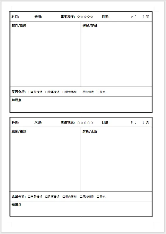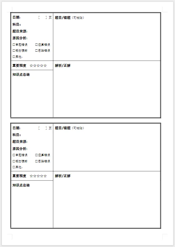 >错题本错题卡模板A4电子版免费下载(Word版可编辑打印)