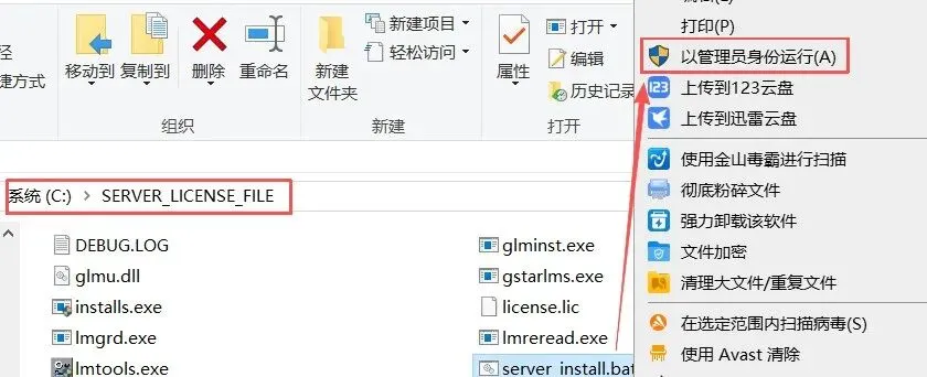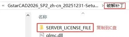 7、将”破解补丁“文件夹中的“SERVER_LICENSE_FILE”文件夹复制到C盘,鼠标右击空白处选择【粘贴】,并右键以管理员身份运行C:\SERVER_LICENSE_FILE\server_install.bat