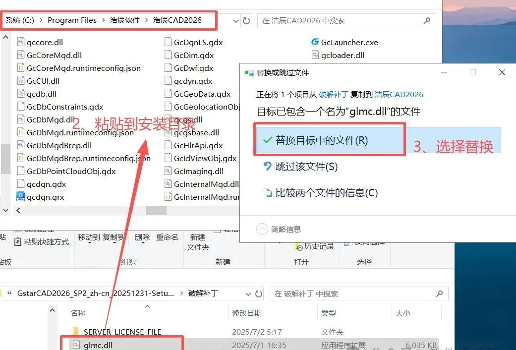 10、在打开的“破解补丁”文件夹中,复制“glmc.dll”文件到文件安装目录并选择替换。(按图示操作)